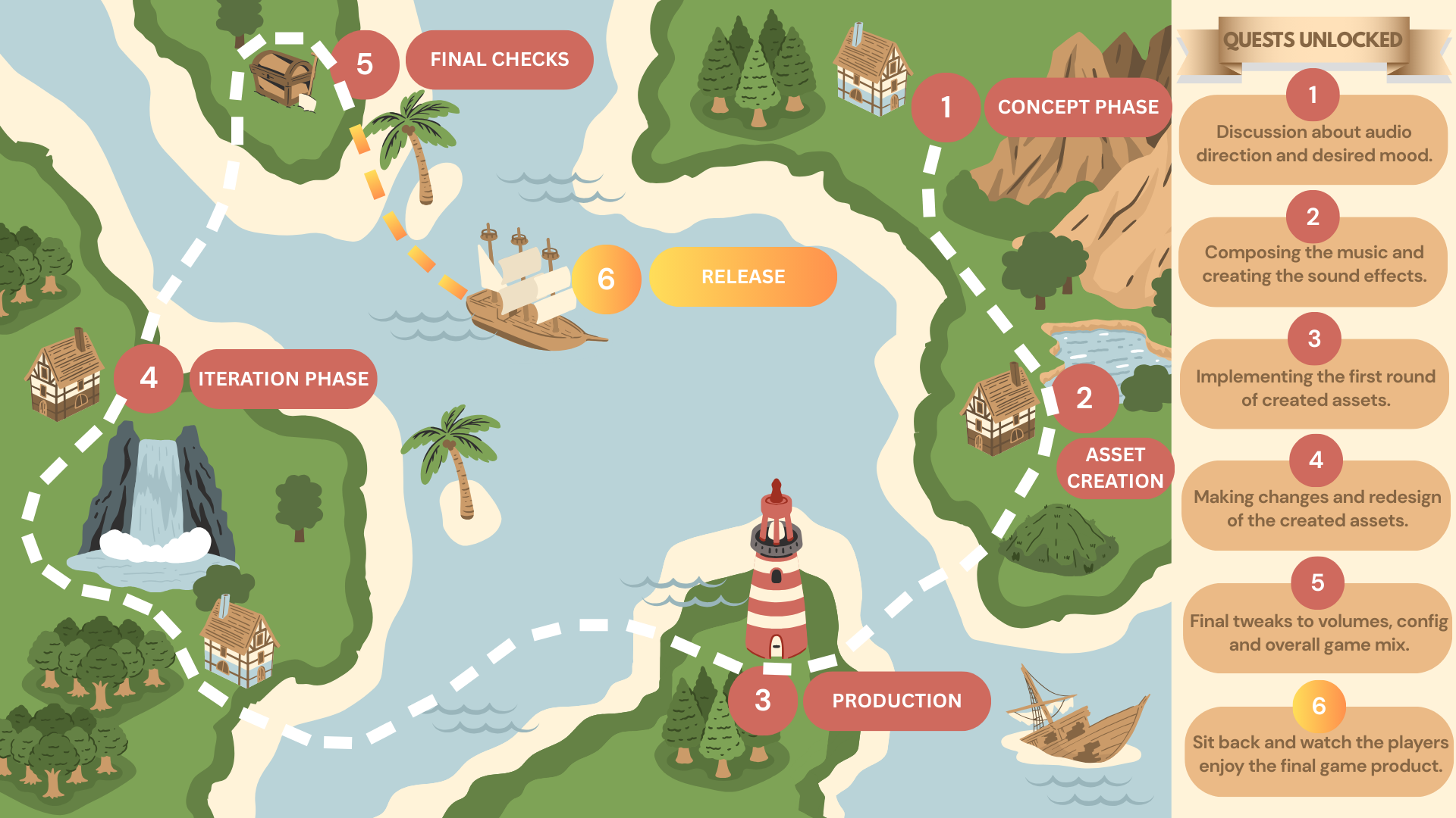 Music and sound effects are composed and designed based on the agreed direction. Assets are produced with implementation in mind.